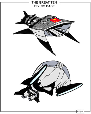 Each story will feature objects never-before-seen, and it is the penciller's job to create the visual for these objects. In this story, there was a LOT of characters and objects to design! On just this one page we see the Great Ten's Flying Base for the first time, as well as the look of the Lao Qigong adherents! At left are my design sheets for the Flying Base and Lao Qigong.