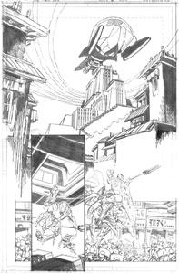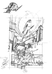 Once the thumbnail image is chosen, it is enlarged to the size shown above (which is nearly the size of the printed comic) and it becomes the foundation for this next sketch stage. The point of the sketch stage is to begin to develop the structural detail underlying the drawing: