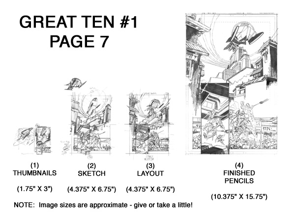 ![]() The steps taken to create Great Ten #1 Page 7! I really enjoyed working on this page, and I thought it would make a good example to share all the steps taken to create it! I have found that this 4-step process works very well for me. I compare it to sculpting: I start with the most general, overall shapes and sizes, and progressively refine the detail in stages to arrive at the final image. All the energy and work involved in each step is not wasted. Quite the contrary. By working on a lightbox, each step taken becomes the foundation for the next step. Nothing is wasted! I also thought it helpful (for all those aspiring artists out there!) to show the relative sizes of each of the steps. Each comic page I create follows these same 4 steps - and each comic page I create begins with very small thumbnails! Onto Step 1 ! |