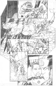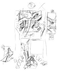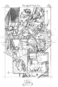 Once the thumbnail image is chosen, it is enlarged to the size shown above (which is nearly the size of the printed comic) and it becomes the foundation for this next sketch stage. The point of the sketch stage is to begin to develop the structural detail underlying the drawing: