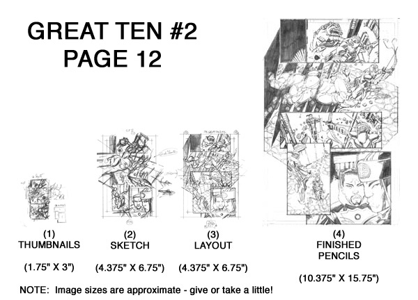 ![]() The steps taken to create Great Ten #2 Page 12! This page was a lot of fun to work on, and I thought it would make a good example to share all the steps taken to create it! I have found that this 4-step process works very well for me. I compare it to sculpting: I start with the most general, overall shapes and sizes, and progressively refine the detail in stages to arrive at the final image. All the energy and work involved in each step is not wasted. Quite the contrary. By working on a lightbox, each step taken becomes the foundation for the next step. Nothing is wasted! I also thought it helpful (for all those aspiring artists out there!) to show the relative sizes of each of the steps. Each comic page I create follows these same 4 steps - and each comic page I create begins with very small thumbnails! Onto Step 1 ! |