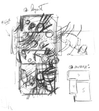 Here's the page layout, developed directly from the sketch completed in the previous step. The point of the layout stage is to lock down enough structural and lighting detail to guide the full size rendering of the next (and last) stage: