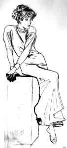 Here's a simple drawing of a woman sitting on a column. Note that the figure is well proportioned and balanced -- that is, it's cylinder body structure is in place. Note also the attention to surface detail, especially the hair and the wrinkle patterns in the clothing.