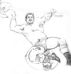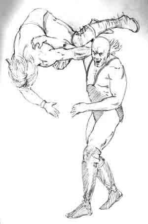 So that's all there is to Action Studies! I have many more such illustrations in my sketch books -- and you should, too! This is a great way to learn the human body in action -- from REALITY! Now that you are getting the handle on drawing the figure in action poses, why not go onto the next section and try your hand at some Bigger-Than-Life Action Shots! The art accompanying this tutorial was completed by me when I was a 22 years old aspiring comic book artist! |