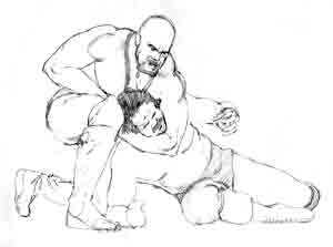 Wrestlers in action! Figure balance and structure, relative size, and movement are all represented. Notice the foreshortening (perspective) of one of each wrestler's legs, and of the choked wrestler's forearms?