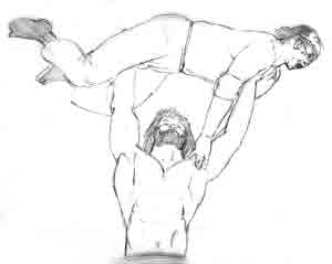 Wrestlers in action! Figure balance and structure, relative size, and movement are all represented. Notice the foreshortening (perspective) of the upside-down wrestler's legs, and the subtle curve of his feet?