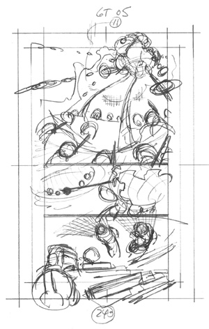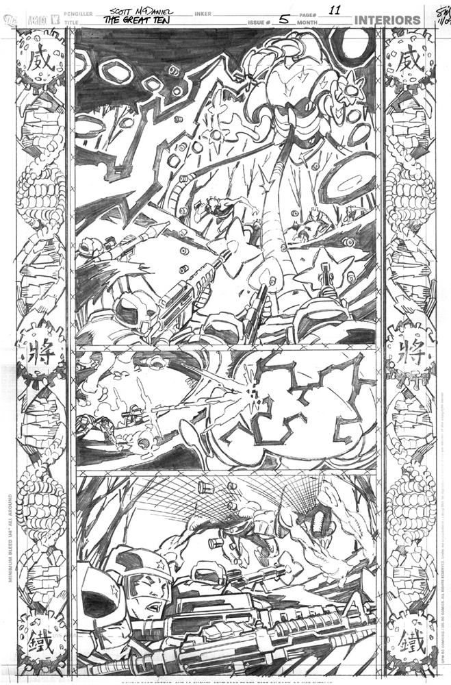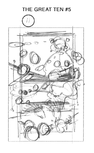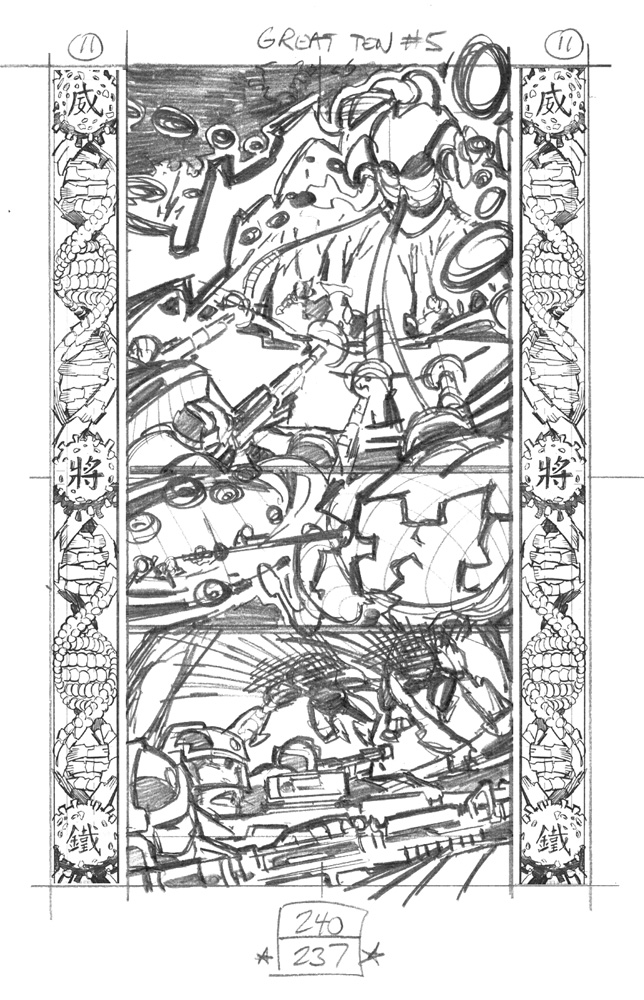 Great Ten #5 Page 11This game discussion is going to simply focus on the visual storytelling of an action sequence.The first four games presented a storytelling process that works very well for me. That process details the development of a page of art through four stages: