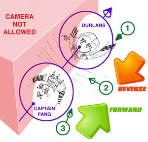 Often it can be very helpful to quickly sketch out the situation you have to draw: the location, and the relative position of the characters to the location and each other. Simply think of this sketch as a little diorama - those little 3D models of historical scenes many of us made in school. Recall that CAPTAIN FANG and his MILITARY TEAM have travelled to the location of the crashed DURLAN SHIP. CAPTAIN FANG is moving FORWARD in the story, thus I assign him the FORWARD left-to-right direction. Consequently, the DURLAN ALIENS will be defending in the REVERSE right-to-left direction. Notice that I grouped FANG'S TEAM into one element, and I grouped the DURLANS into another element. Then, the action-axis is simply the line that connects these two elements. Because I have assigned FANG to move LEFT-TO-RIGHT, the cameras MUST be on the clear side of the action axis. Everything on the other side of the action-axis (marked in RED) is a NO GO ZONE for the cameras! Now all that remains is to choose camera locations. I spotted 3 general locations: