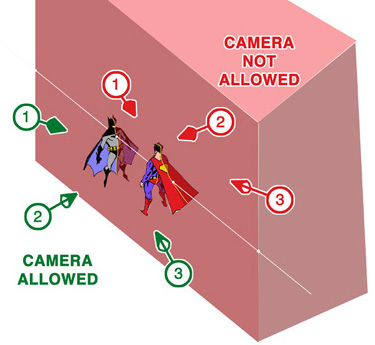 In reality, the "action-axis" is a "line" only when considered from a top view. It's more accurate to think of the"action-axis" as an "action-plane." It is an invisible, imaginary, vertical "plane," or wall, that slices through the scene, stretching upwards to the stars and downwards through the earth. Thus, for any camera angle you want to use (worm's eye, bird's eye, close-up, long-shot, or even a staged series of camera positions that spiral and zoom in any combination of vertical and lateral positions), keep ALL the camera positions on one side of the "plane" and the relative positions and direction of travel of objects in your scene will remain consistent. One last note specifically to the comic artist: it is NOT acceptable to arbitrarily switch character positions on the page merely to simplify the placement of dialog and captions. If you MUST switch character positions, you MUST use a NEUTRAL or CROSSING shot. More on this later!
