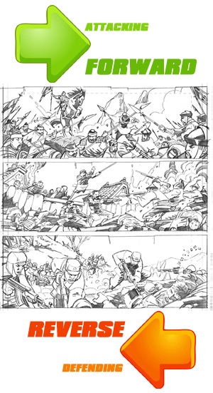 Direction of travel is a concept that must be properly managed to visually tell a story. It is intimately related to the "action-axis" discussed above. Forward travel is defined as moving from left-to-right, in the direction that we Westerners read. If you define a movement of a character to be from left-to-right, the subconscious perception is that he is moving "forward." If you define a movement that is right-to-left, the subconscious perception is that he is moving "backwards." In comics, you'll want to use this concept to define the direction of motion. Usually, an offensive action (heroic or villainous) proceeds in the forward direction. Thus, when two forces fight,