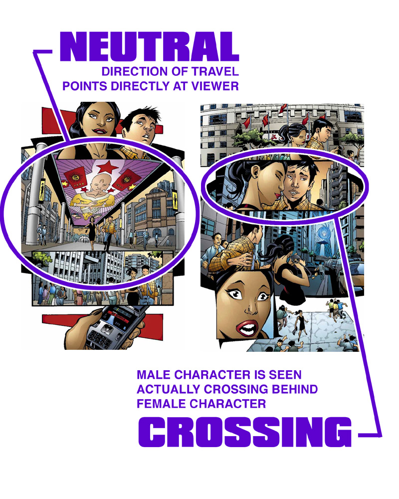 These two classes of shots facilitate changes of travel direction and relative character positions. They are very useful in film and comics. NEUTRAL Used when the direction of travel must be reversed. A "neutral" shot is one where the direction of travel is DIRECTLY TOWARD or DIRECTLY AWAY from the viewer. If you must change the direction of travel, use a neutral shot to show the direction change in progress. CROSSING Used when the relative position of on-screen characters must be reversed. A "crossing" shot is one where the characters are literally seen crossing. If you must flip the relative position of the characters on-screen, use a crossing shot to show the flip in progress.
