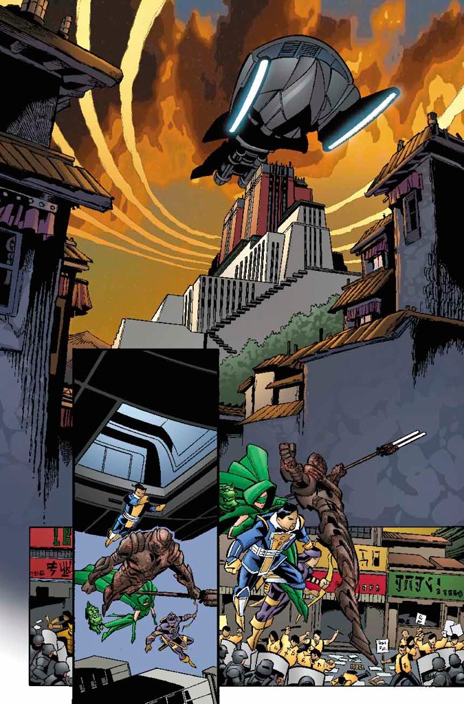 Each story will feature objects never-before-seen, and it is the penciller's job to create the visual for these objects. In this story, there was a LOT of characters and objects to design! On just this one page we see the Great Ten's Flying Base for the first time, as well as the look of the Lao Qigong adherents! At left are my design sheets for the Flying Base and Lao Qigong.