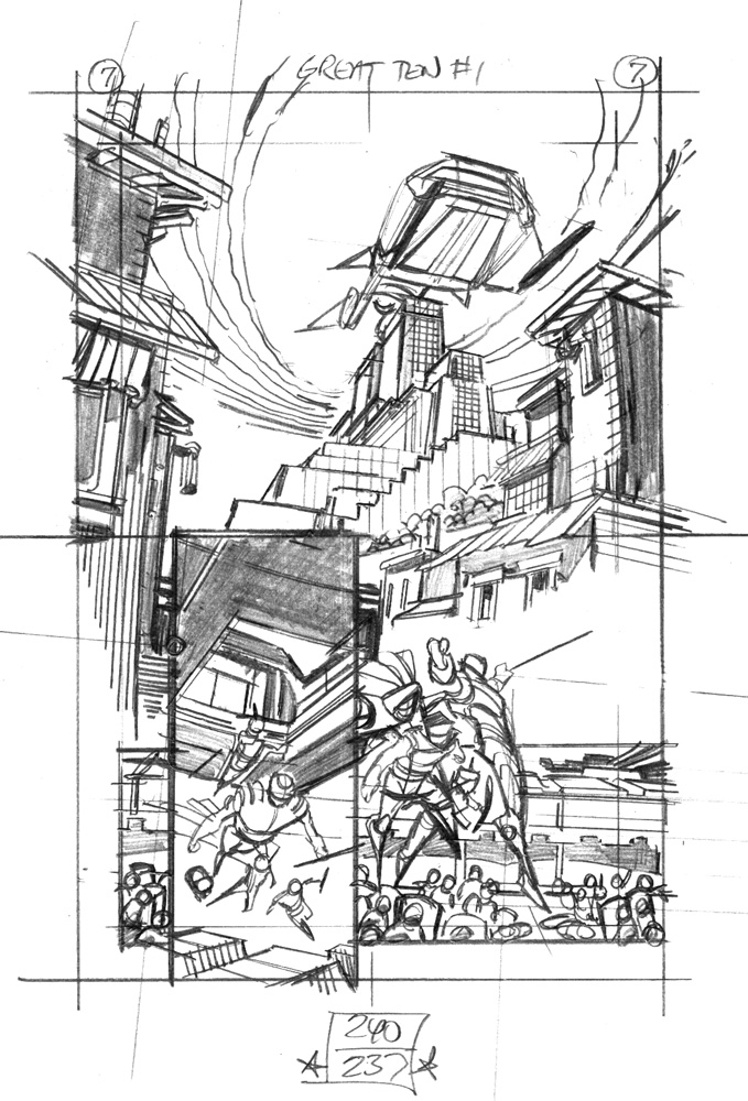Once the thumbnail image is chosen, it is enlarged to the size shown above (which is nearly the size of the printed comic) and it becomes the foundation for this next sketch stage. The point of the sketch stage is to begin to develop the structural detail underlying the drawing: