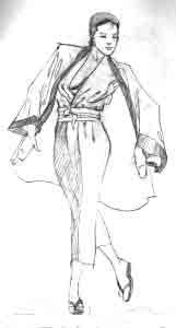 This is a figure of a woman walking. Notice the balance of the walking figure, and the flow of the lose clothing. Again, figure balance is best worked out at the cylinder body stage, as position changes are easy to do. Then, with the balanced body figured out, determine how the loose clothing drapes over that figure.